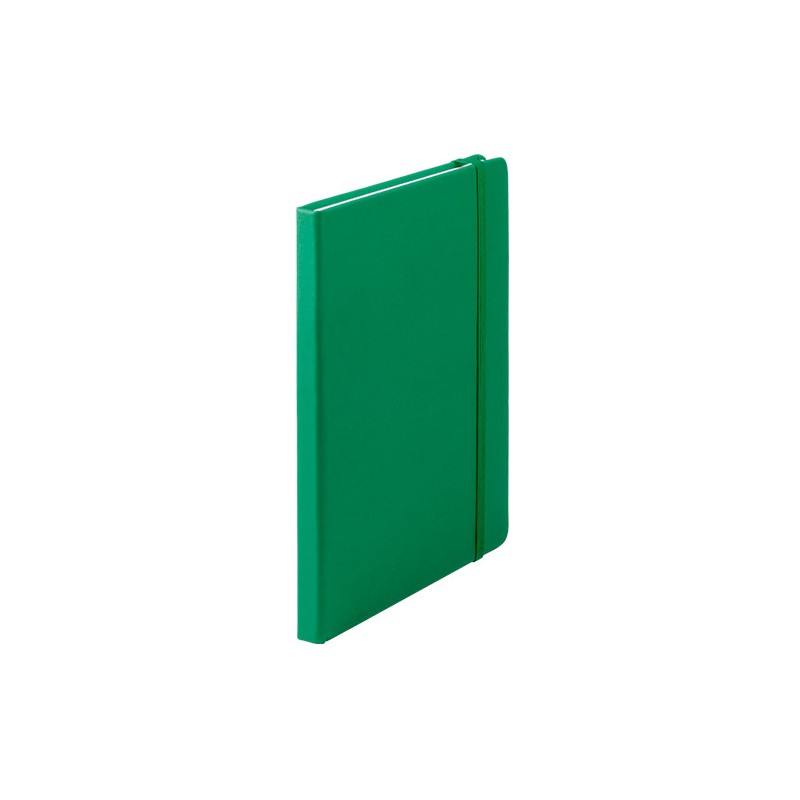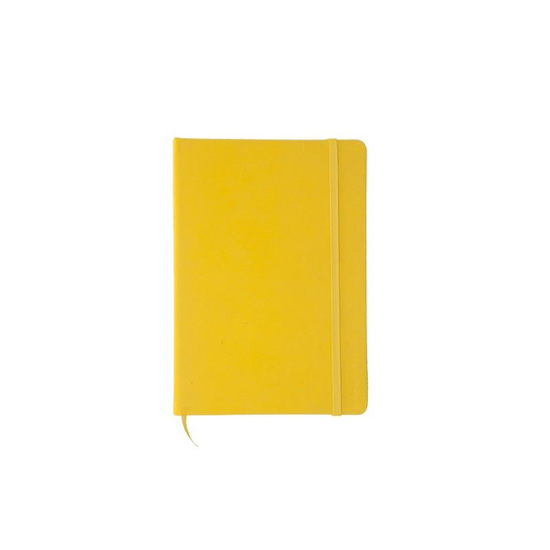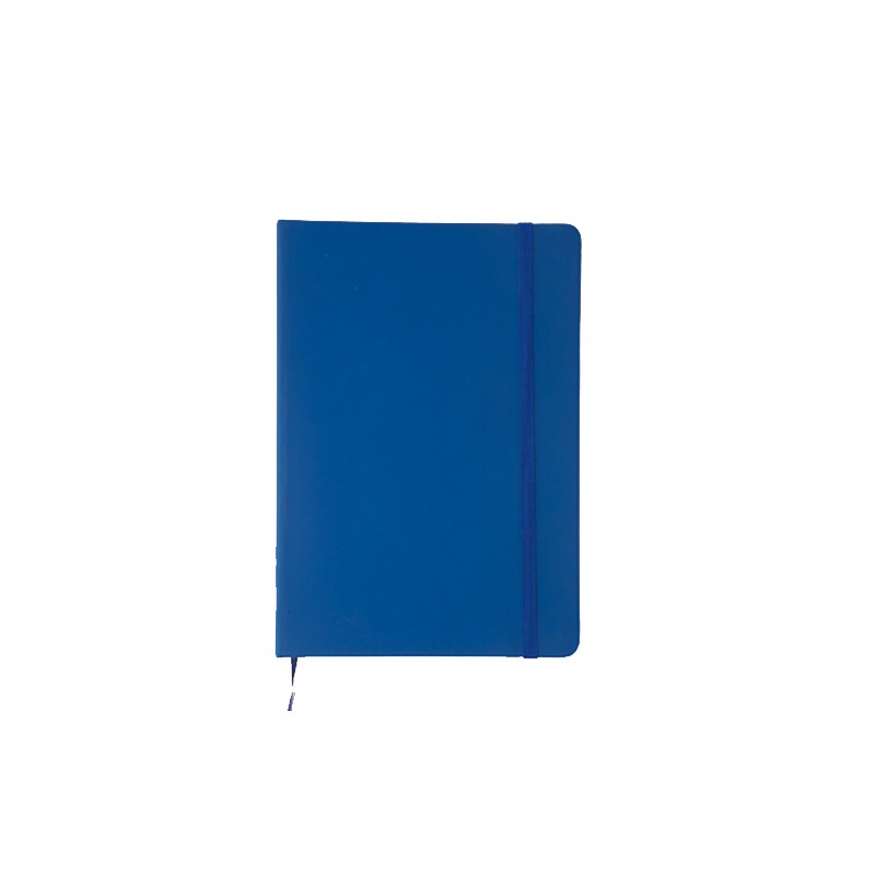 Bloc de notas con tapas de suave tacto, acabado en polipiel y en desenfadados colores. De 100 hojas lisas, con elástico de sujeción y marcapáginas de tela a juego.